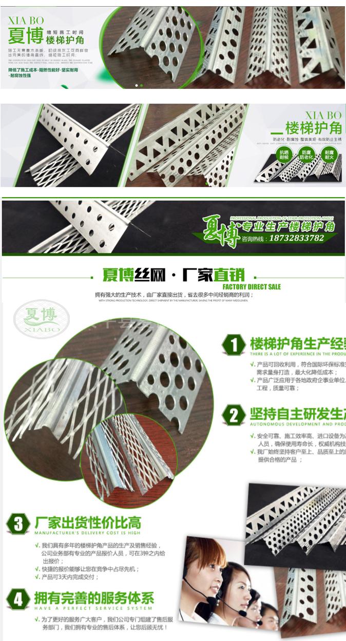 (1)尺寸:樓梯護(hù)角網(wǎng)是成長條形的護(hù)角,一邊是寬30、50、70mm。
